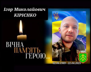 22 квітня 2025 року стрілець-снайпер другого аеромобільного відділення 46-ї окремої аеромобільної Подільської бригади десантно-штурмових військ ЗСУ, солдат Ігор Миколайович КІРІЄНКО загинув під час виконання бойового завдання внаслідок ураження дроном на Донеччині.