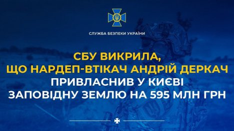 Служба безпеки викрила масштабну схему привласнення земель природно-заповідного фонду Києва на понад 595 млн грн. До організації оборудки причетний колишній народний депутат України від Сумщини Андрій Деркач, який підозрюється у держзраді та переховується в рф.