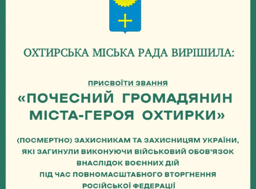 16 жовтня на 66-й (позачерговій) сесії Охтирської міської ради депутати ухвалили рішення про присвоєння звання «Почесний громадянин міста-героя Охтирки» (посмертно) сімом Захисникам України, які загинули внаслідок повномасштабного вторгнення російської федерації.