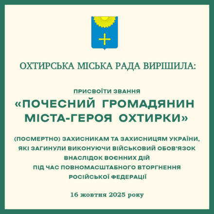 На сесії Охтирської міської ради депутати ухвалили рішення про присвоєння звання «Почесний громадянин міста-героя Охтирки» (посмертно) Захисникам України, які загинули внаслідок повномасштабного вторгнення російської федерації.