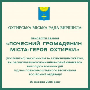 16 жовтня відбулося засідання 66-ї (позачергової) сесії Охтирської міської ради, на якому депутати ухвалили рішення про присвоєння звання «Почесний громадянин міста-героя Охтирки» (посмертно) Захисникам України, які загинули внаслідок повномасштабного вторгнення російської федерації.