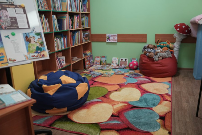 У читальній залі бібліотеки є килимок для здійснення бажань, каже Наталія Піддубна: “Діти з батьками можуть розслабитися,пограти, почитати і просто полежати”.