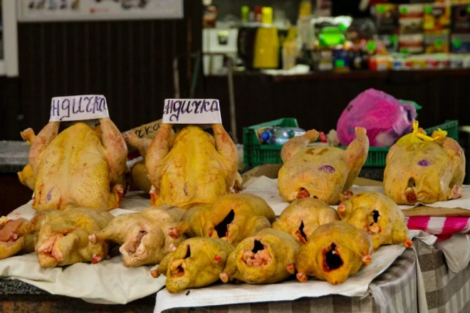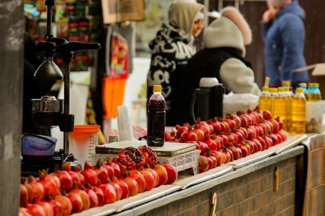 Селянський базар працює з вівторка по неділю з 8:00 до 17:00. На прилавках м’ясо, овочі та фрукти, спеції, мед, гранатовий сік і соління. Також продають індичок, качок, курей, індокачок і гусок. Серед сезонних товарів – банні віники та композиції з хвої і сухоцвіту.