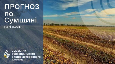 4 жовтня: хмарно з проясненнями, вночі без опадів, вдень місцями невеликий дощ. Вітер південно-східний, 7-12 м/с. Температура повітря по області вночі +3°..+8°, вдень, +13°..+18°, по м.Суми вночі +5°..+7°, вдень, +16°..+18°.