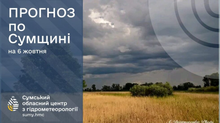 6 жовтня: хмарно з проясненнями, без істотних опадів, вночі та вранці слабкий туман. Вітер південний, 3-8 м/с. Температура повітря по області вночі +5°..+10°, вдень, +11°..+16°, по м.Суми вночі +6°..+8°, вдень, +14°..+16°.