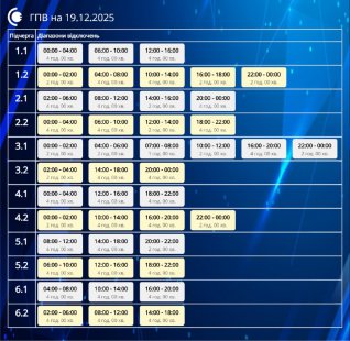 Завтра, 19 грудня, діятимуть графіки погодинних відключень відповідно до обсягів, доведених командою з НЕК “Укренерго”.