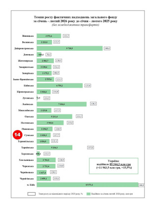 Як повідомляє Департамент фінансів Сумської обласної державної адміністрації, приріст надходжень до загального фонду місцевих бюджетів за січень-лютий 2026 року порівняно з відповідним періодом минулого року в середньому по Україні склав 15,5% (+12 млрд гривень).