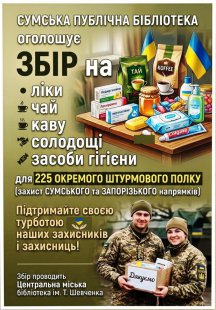 Сумська публічна бібліотека збирає «пакунки турботи» для бійців 225-го окремого штурмового полку, які сьогодні тримають оборону на сумському та запорізькому напрямках.