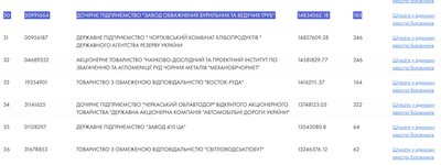 Скриншот списку підприємств України, що мають борги по виплаті заробітної плати. Єдиний реєстр боржників