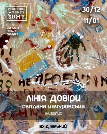 О 17:00 відбудеться відкриття другої експозиції — «Лінія довіри». Це спільний проєкт художниці Світлани Качуровської та її учнів. Світлана понад 12 років допомагає людям різного віку та професій реалізувати свої мрії через малювання. Представлені роботи створені як світла віддушина в складні часи, відображаючи щирі емоції та особливі сенси кожного автора. Обидві виставки покликані подарувати сум’янам відчуття надії та віри у відродження через красу і творчість.