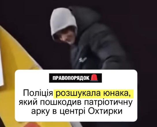 Як повідомили в Охтирській міській раді, подія трапилася 16 листопада о 20:00. Небайдужа перехожа відзняла момент, як юнак заліз на верх арки і пошкодив декоративні елементи конструкції. Це також зафіксували вуличні камери відеоспостереження.