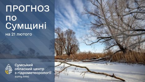 21 лютого температура по області вночі становитиме -13°..-18°, вдень -3°..-8°. У Сумах вночі очікується -13°..-15°, вдень -3°..-5°. Вітер буде змінних напрямків, 3-8 м/с.