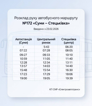 Із понеділка, 23 лютого, змінюється розклад руху на автобусному маршруті №172, що сполучає Суми та Стецьківку.