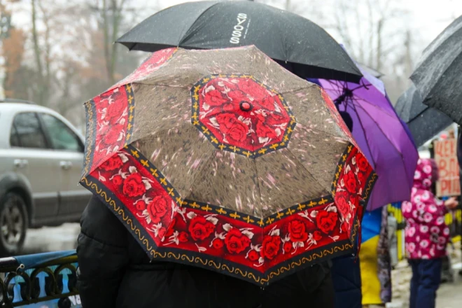 Під однією парасолею стоять Аліна та Віталіна. Дві подруги прийшли на акцію, аби нагадати про зниклого безвісти друга та коханого, який зник взимку 2024 року поблизу населеного пункту Кринки.