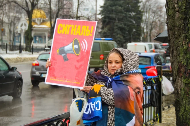 Наталія тримає плакат, де великими літерами написано «СИГНАЛЬ». Жінка розповідає, що прийшла на акцію, бо чекає на брата та чоловіка: