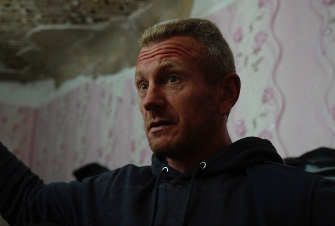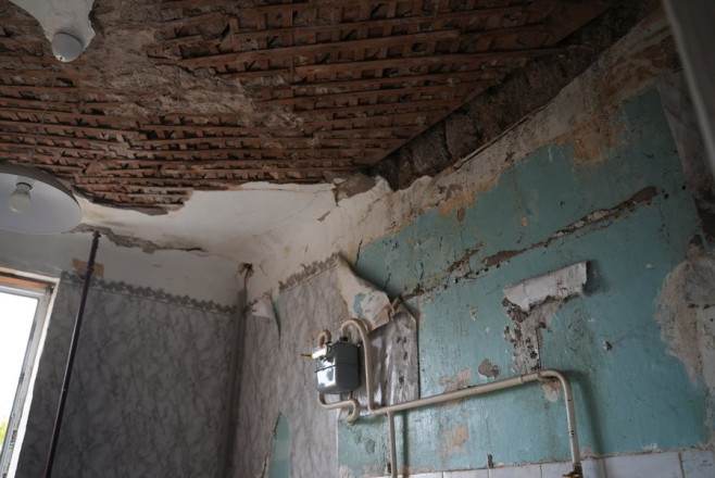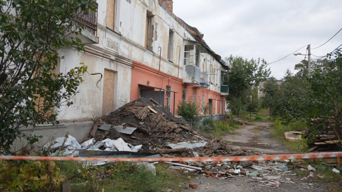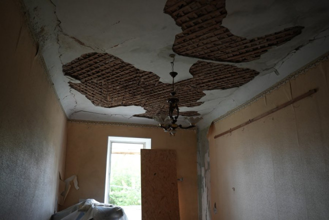 "Ходити ніяк, дахи провалюються, акуратно працюємо. Дуже акуратно. Гляньте — все воно валиться, його треба зносить, та й усе", — говорять будівельники, що ремонтують пошкоджений будинок.