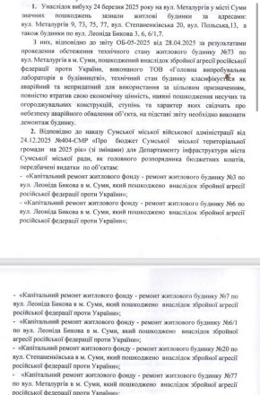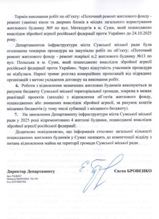 Завершити ремонти у будинках №75 та №77 на вулиці Металургів, а також №20 по вулиці Степаненківська планують до 24 квітня 2026 року. Ремонтні роботи у пошкоджених будинках по вулиці Бикова мають виконати до кінця цього року, а поточний ремонт у будинку №9 по вулиці Металургів — до 24 жовтня 2025 року.