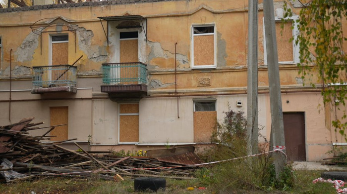 За словами майстра Сергія, працюють тут другий тиждень. Почали з основного — даху та фасаду: "Ми будемо робити дах, фасад, щоб не текло на голову. А кожна квартира буде індивідуально, окремо буде розглядатися".