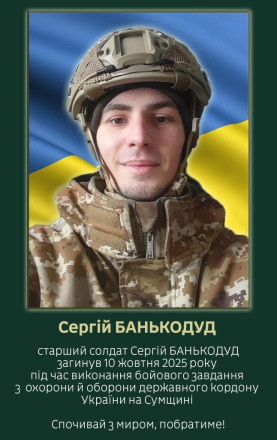 Життя 26-річного Сергія Банькодуда обірвалося 10 жовтня 2025 року під час виконання бойового завдання з охорони й оборони державного кордону України на Сумщині.