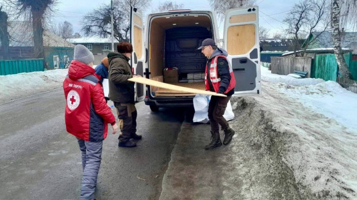 У селі Крупець люди отримують будівельні матеріали після російської атаки, 3 березня 2026 року. Сумська обласна організація Товариства Червоного Хреста України