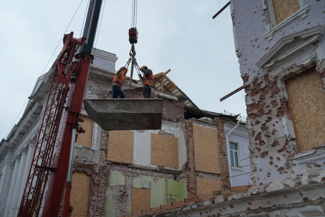 "Зараз ми намагаємося зробити покрівлю, і ви бачите, це буде тимчасова покрівля, але сама основа вже буде на постійне. Демонтаж, і паралельно зараз уже розпочинаються роботи з проєктування, власне кажучи, самого відновлення всієї будівлі. Ось, я сподіваюся, що до кінця цього року в нас уже буде відкрито відповідно проєкт. Ми оцінюємо, що відбудова вартує десь до 50 млн грн. Ми шукаємо ці гроші, поки що в їх немає в нас повною мірою, але є певні допомоги. Я сподіваюся, що буде допомога як від держави, так і від наших спонсорів, від наших благодійників", — сказав Василь Карпуша, ректор Сумського державного університету.