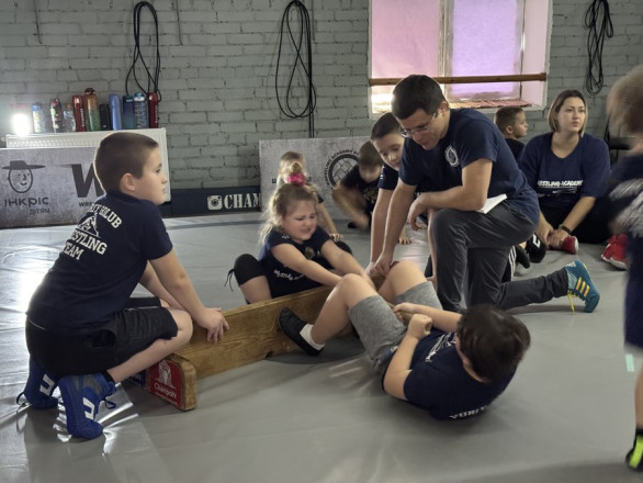 Першими на килим "Академії боротьби" вийшли наймолодші вихованці. Вони займаються від пів року. Спочатку юні борці боролись за спрощеними правилами, потім – у мас-реслінгу перетягування палиці.
