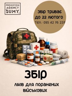 Агенція промоції «Суми» розпочала збір необхідних медикаментів для потреб наших захисників. Усіх охочих просять долучитися та принести базові ліки, які допоможуть підтримати здоров’я військових на передовій.