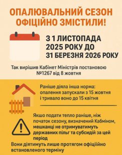 Кабінет Міністрів України затвердив нову норму, згідно з якою, опалювальний сезон в України триватиме з 1 листопада по 31 березня.