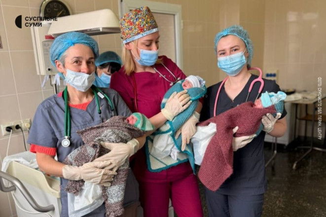 Трійня з’явилася на світ у Сумському обласному перинатальному центрі. Це хлопчик і дві дівчинки вагою від 1 кг 300 грамів до 1 кг 900 грамів. Немовлята народилися шляхом кесаревого розтину на 32 тижні вагітності. Батьки відвідують своїх новонароджених у відділенні інтенсивної терапії.