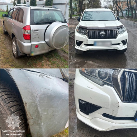 Днями патрульні отримали повідомлення про ДТП на вулиці Ярослава Мудрого. Інспектори встановили, що водій автомобіля Chery, рухаючись заднім ходом, не переконався в безпечності маневру, унаслідок чого здійснив наїзд на припаркований автомобіль Toyota. Після цього чоловік залишив місце автопригоди.