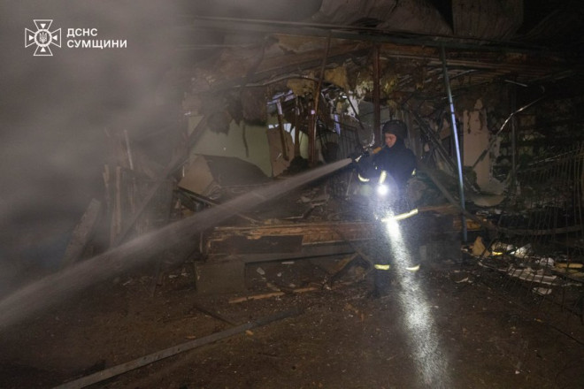 - у Сумській громаді – нежитлове приміщення. За уточненням ДСНС, вночі через атаку БпЛА було частково зруйноване нежитлове приміщення. Сталося загоряння. Пожежу ліквідували;