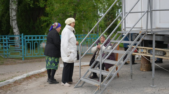 Жителі Великої Писарівки біля мобільної амбулаторії. Травень, 2024. Фото: Суспільне Суми