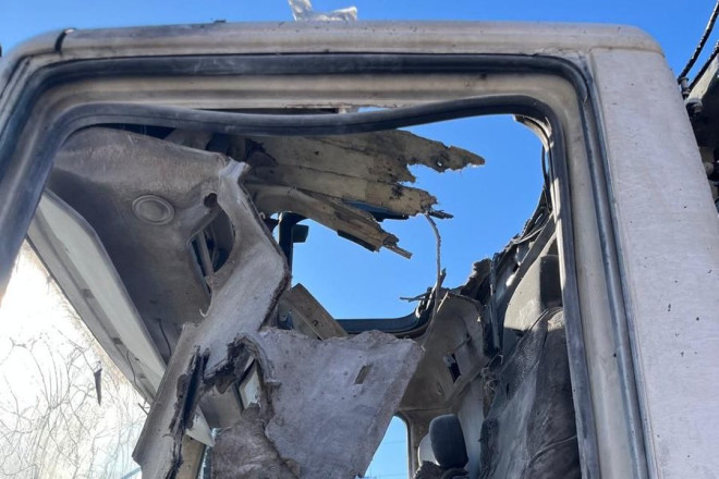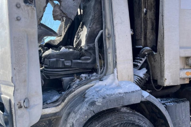 Сміттєвоз, пошкоджений після удару російського дрона у Верхньому Піщаному 10 лютого 2026 року. Суспільне Суми