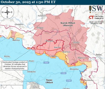 Як повідомив Інститут вивчення війни (ISW), геолоковані кадри, опубліковані 30 жовтня, підтверджують, що українські сили нещодавно просунулися на схід Костянтинівки (на північ від Сум, поблизу кордону). Ті самі кадри свідчать, що ЗСУ, ймовірно, звільнили Кіндратівку (на південь від Костянтинівки) ще раніше.