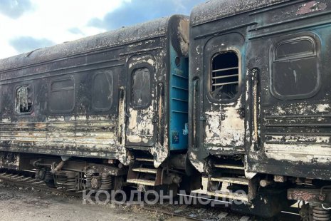 Колії та вагони: Поблизу вокзалу утворилася велика вирва. На коліях стоять понівечені вагони без вікон та в кіптяві після пожежі.