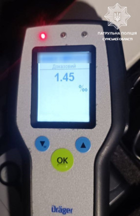 Під час перевірки документів у 23-річного громадянина патрульні виявили явні ознаки алкогольного сп’яніння. Чоловік цього не заперечував та пройшов огляд на місці зупинки. Прилад Драгер зафіксував позитивний результат — 1,45 проміле алкоголю.