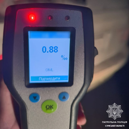Під час перевірки документів патрульні виявили у 27-річної громадянки ознаки алкогольного сп’яніння. Жінка погодилася пройти огляд на місці зупинки. Результат — 0,88 проміле алкоголю.