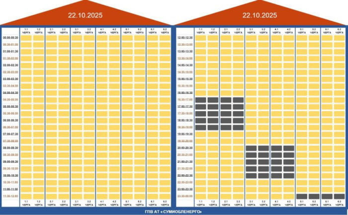 Сьогодні, 22 жовтня, починаючи з 16:30, будуть діяти графіки погодинних відключень електроенергії (ГПВ) відповідно до наведеної таблиці.