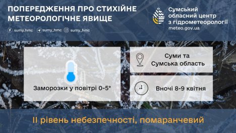Особливу увагу синоптики звертають на 8 та 9 квітня. У ці дні вночі по Сумській області та в місті Суми прогнозують заморозки у повітрі від 0° до -5°, що відповідає II (помаранчевому) рівню небезпечності. Денна температура в ці дні не перевищуватиме +4°..+10°.